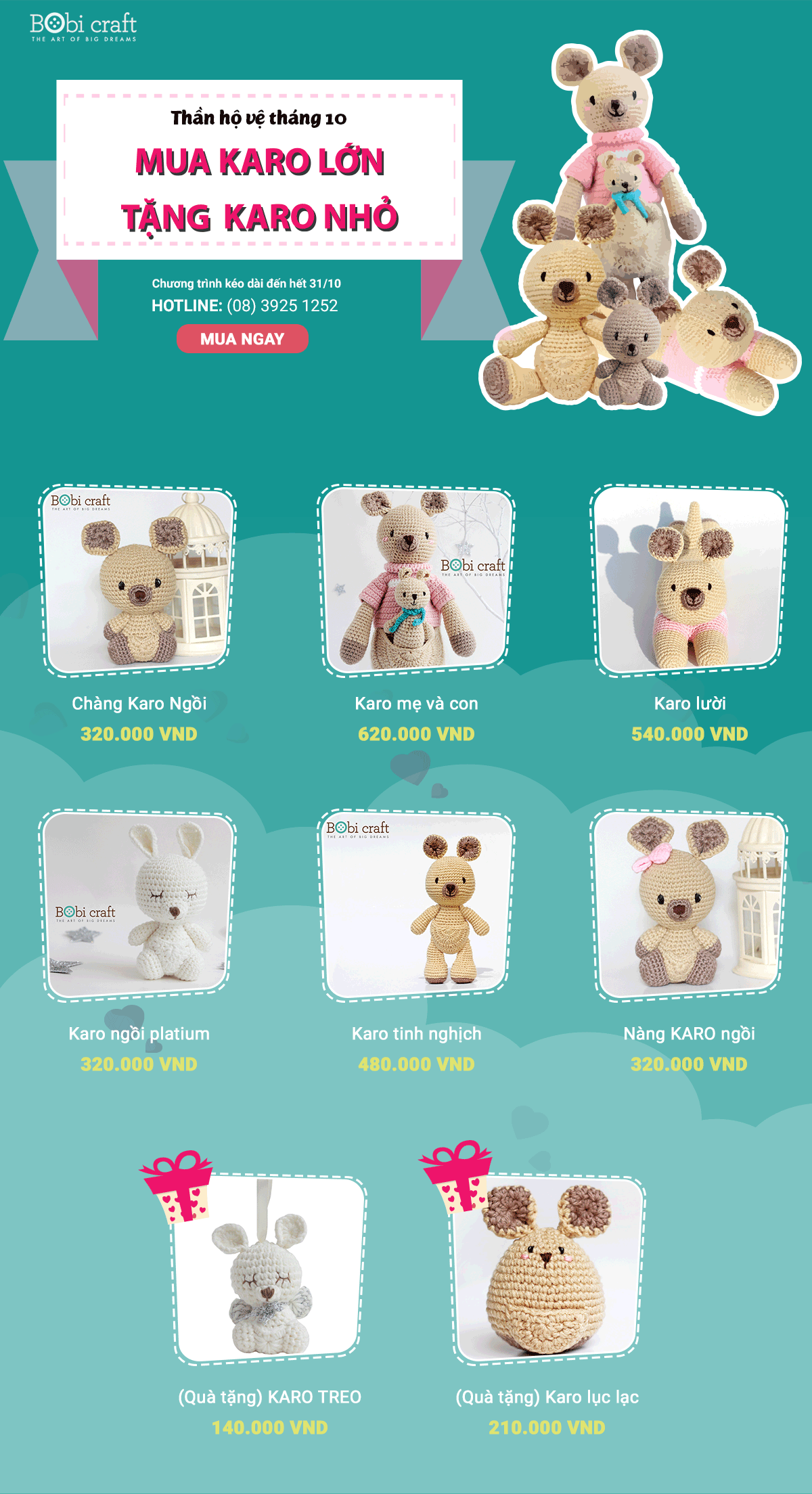 Sản phẩm áp dụng: Mua bất kì bạn Karo lớn nào trong các bộ đứng, ngồi và nằm đều được tặng 1 bạn Karo nhỏ: Karo treo hoặc Karo lục lạc.