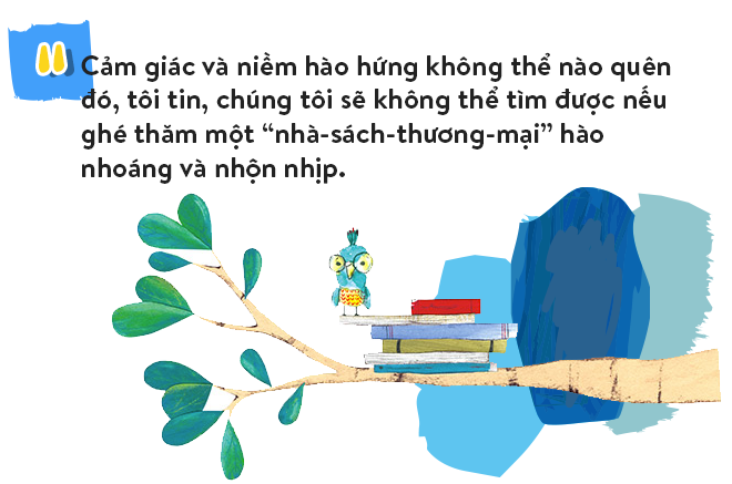 Các nhà sách lớn, dù có được thiết kế hiện đại và thu hút đến đâu, cũng không phải là một nơi chốn hoàn hảo với các bạn nhỏ dưới 6 tuổi. Để các con có thể tha thẩn, chậm rãi ngó nghiêng và tự mình với tay lên một kệ sách để lấy xuống cuốn sách mình thích thú mà không bị ai giục giã làm phiền; không bị những âm thanh ồn ào làm cho khó chịu, cáu kỉnh; không bị cảm giác choáng ngợp làm cho bối rối.